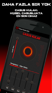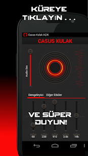 Casus kulak bir casuslu uygulamasıdır . Hemen lafı uzatmadan bahsediyorum . Kulaklığı takıyorsunuz , müzik dinliyormuş gibi yapıp uygulamayı açıyorsunuz . Daha sonra uygulamanın ortasındaki kırmızı düğmeye basıyorsunuz ( Kendi ScreenShot'ımızı  atacaktık ama bir problem çıktı) Sonra ekran üstüne Casus Kulak açık diye bir ibre beliriyor ve siz de etrafınızdaki sesleri direk kulağınıza gelecek şekilde dinliyorsunuz .